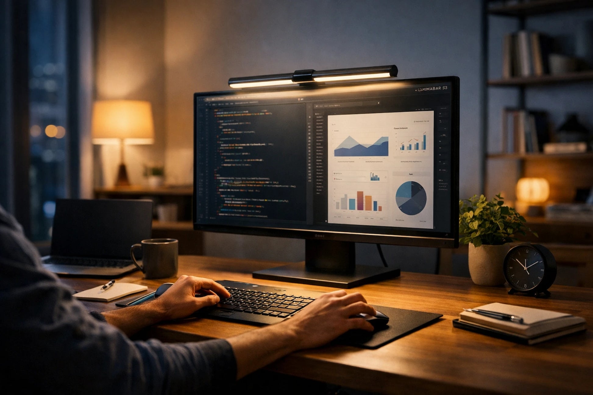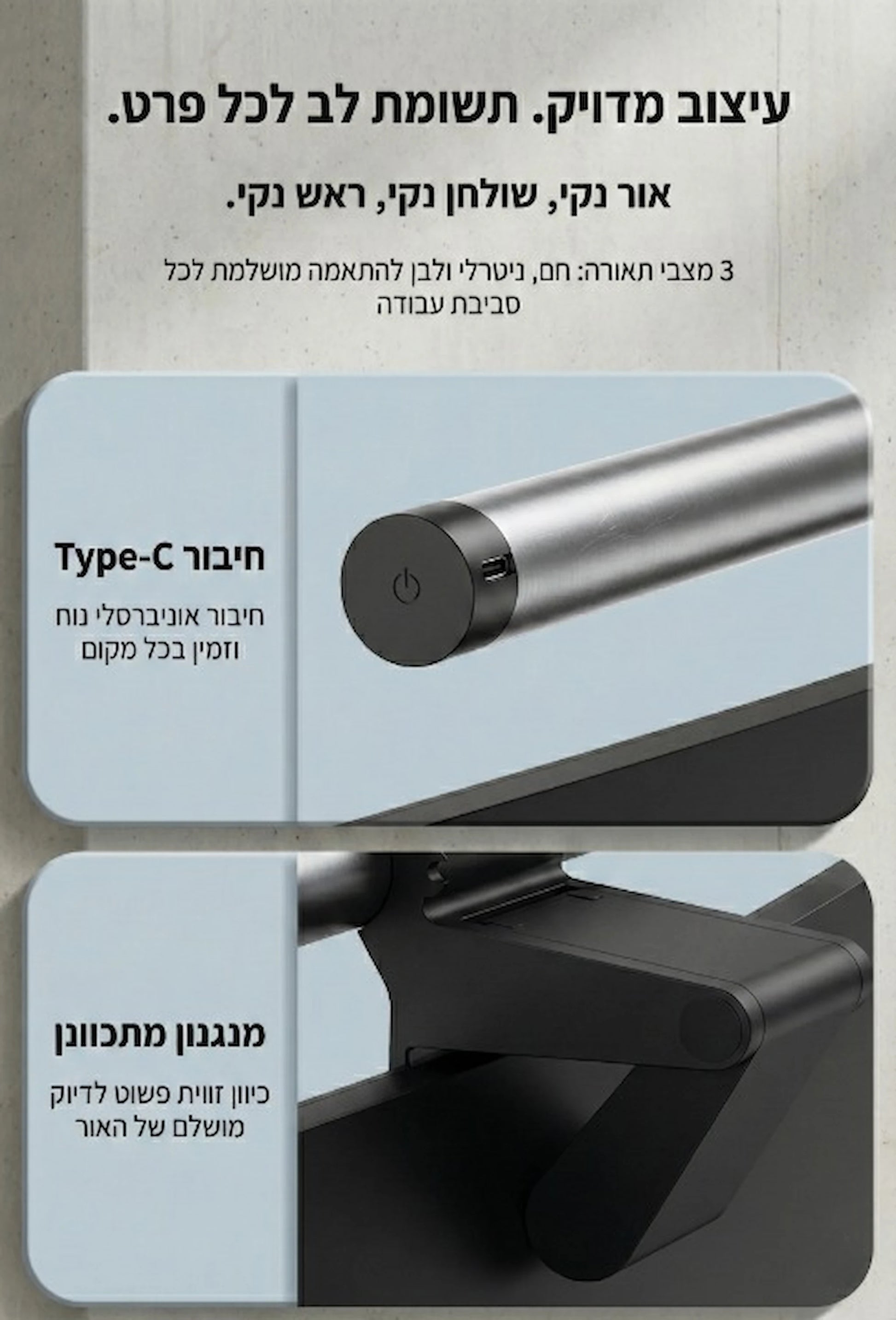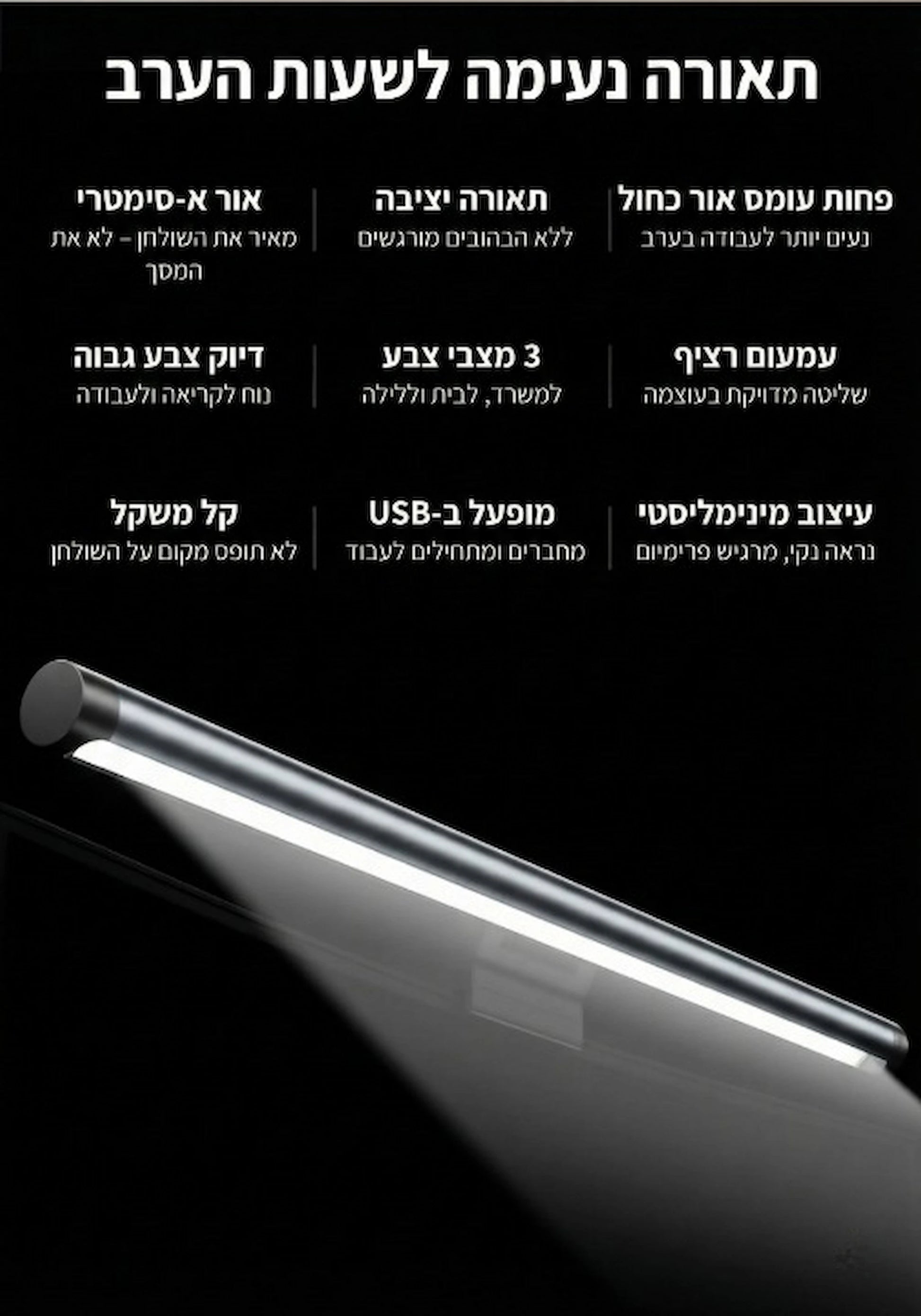 פשוט תולים על המסך, מחברים ל-USB (מחשב, מטען או סוללה ניידת), מכוונים זווית ואור - ומתחילים לעבוד בנוחות אחרת לגמרי.